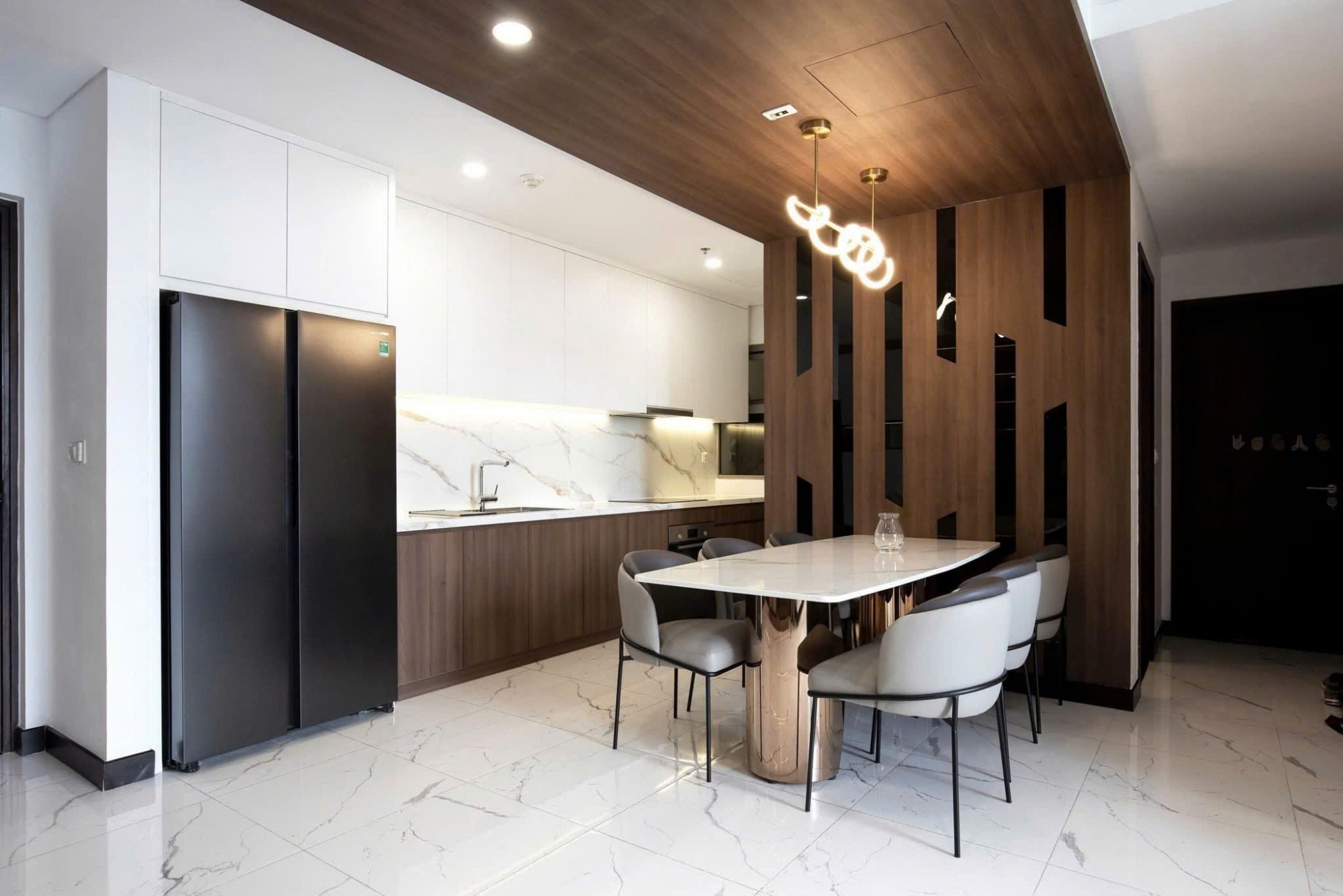 Điểm nhấn nổi bật nhất của căn hộ chính là trần cao lên đến 3,6m, mang lại cảm giác không gian cực kỳ thoáng đãng, sang trọng và khác biệt so với các căn hộ thông thường. Thiết kế trần cao giúp tối ưu ánh sáng tự nhiên, tăng độ thoáng và giá trị thẩm mỹ tổng thể.
