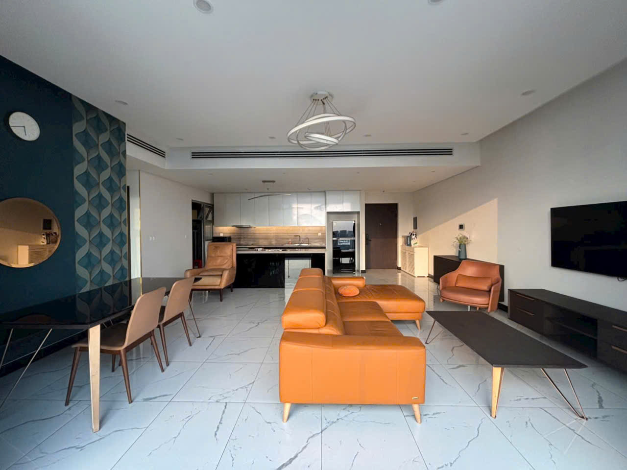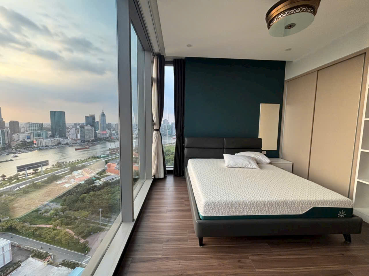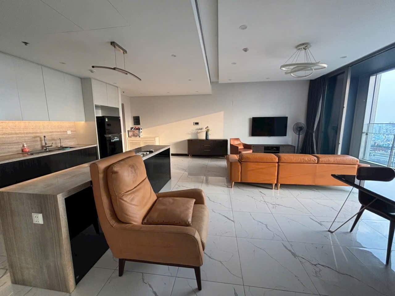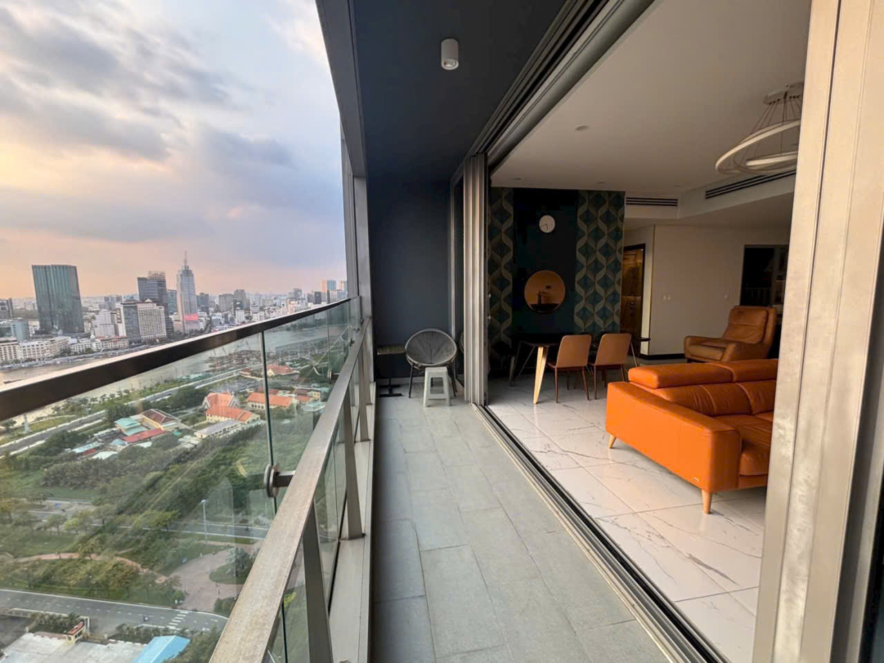 Phòng khách nổi bật với bộ sofa da lớn kết hợp layout rộng rãi và liên thông trực tiếp với khu bếp và bàn ăn giúp tạo nên không gian sinh hoạt chung thoải mái và tiện nghi Hệ cửa kính lớn mang lại tầm nhìn sông thoáng mát đồng thời giúp căn hộ luôn tràn ngập ánh sáng