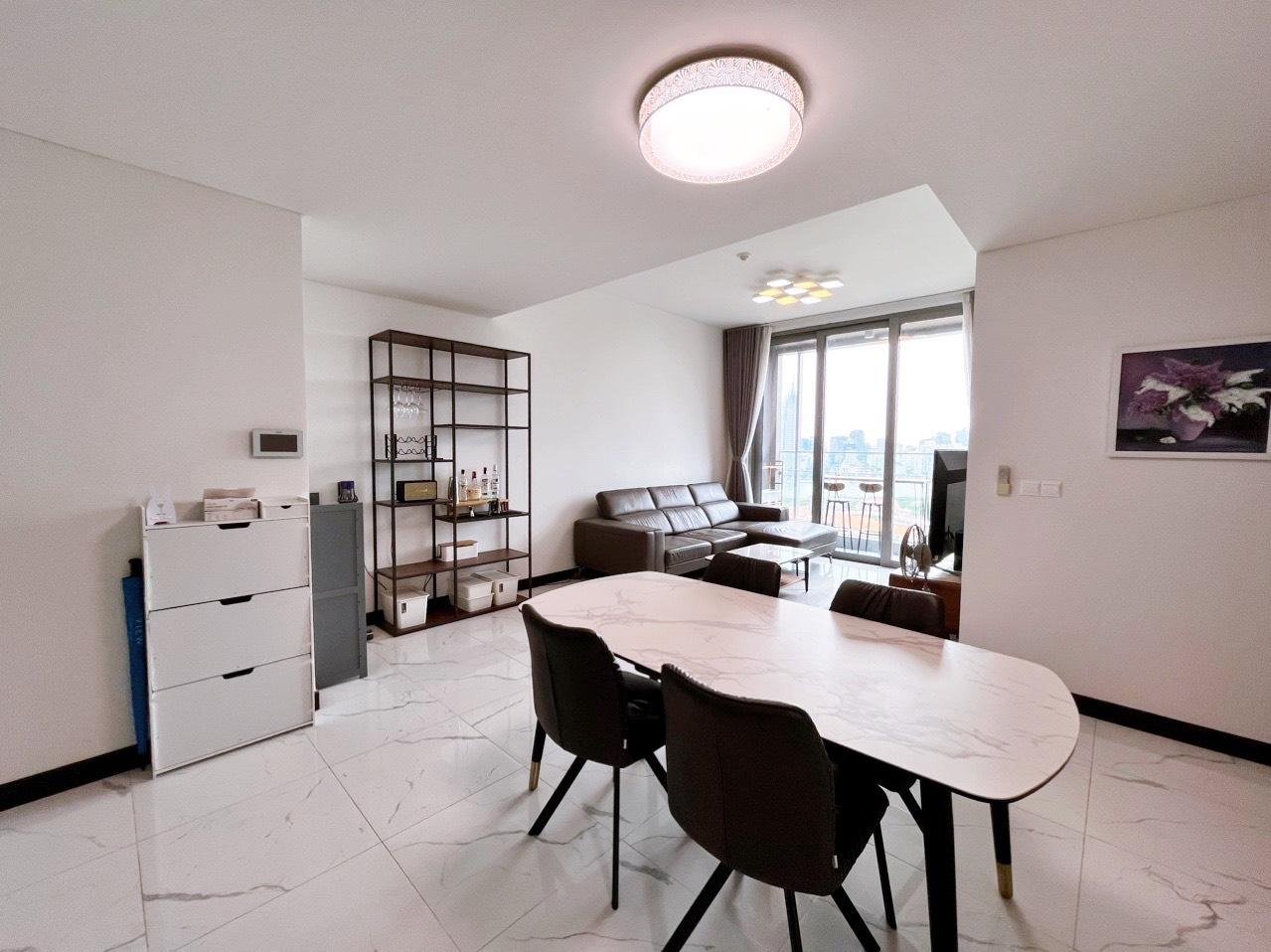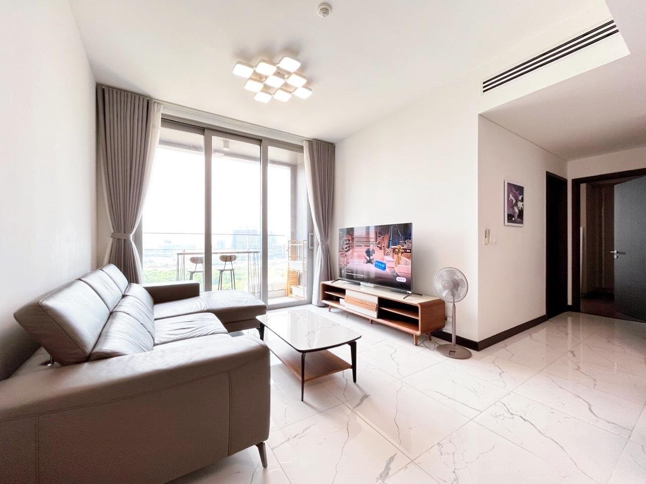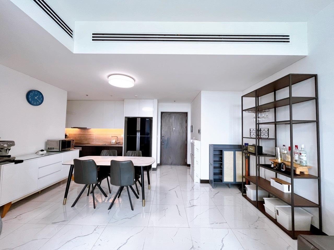 Căn hộ có diện tích 91m², thiết kế 2 phòng ngủ hợp lý, không gian phòng khách rộng và thoáng. Căn hộ được trang bị full nội thất, phong cách hiện đại, khách thuê có thể dọn vào ở ngay. Phòng khách kết nối ban công, đón ánh sáng tự nhiên và gió mát, mang lại cảm giác dễ chịu. Khu bếp tiện nghi, bố trí gọn gàng. Các phòng ngủ đều đảm bảo sự riêng tư và thoải mái.