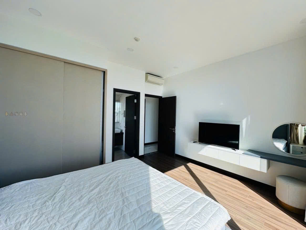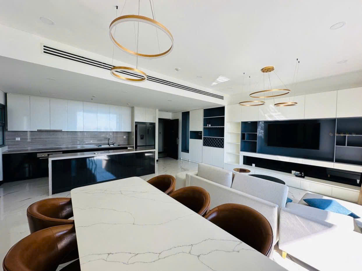 Khu vực bếp và bàn ăn được thiết kế liền mạch, trang bị đầy đủ thiết bị hiện đại, phù hợp cho sinh hoạt gia đình và tiếp khách. Ba phòng ngủ được bố trí hợp lý với nội thất đầy đủ, mang lại sự riêng tư và thoải mái cho từng thành viên. Các phòng đều có cửa sổ lớn giúp không gian luôn sáng và thoáng.