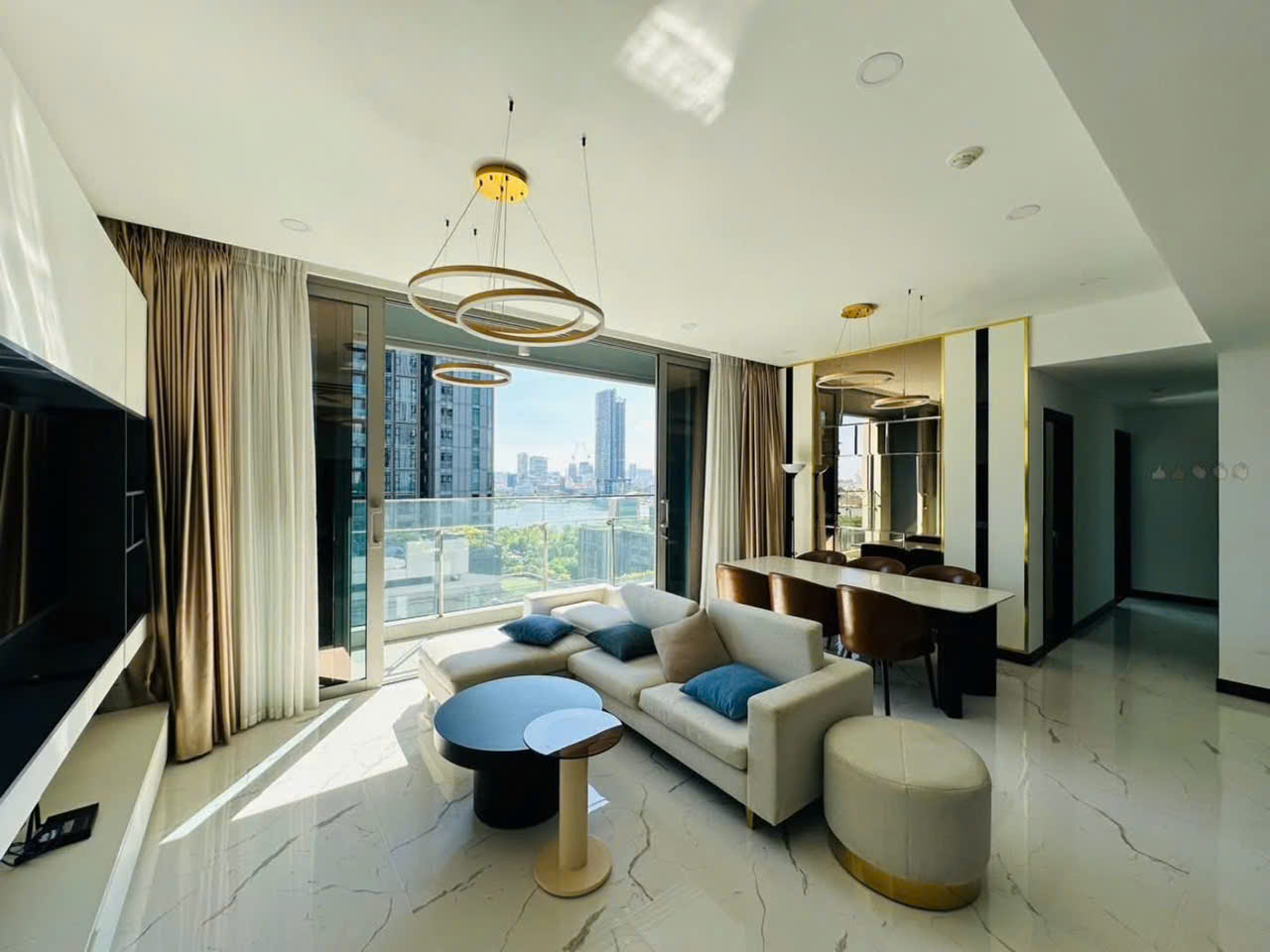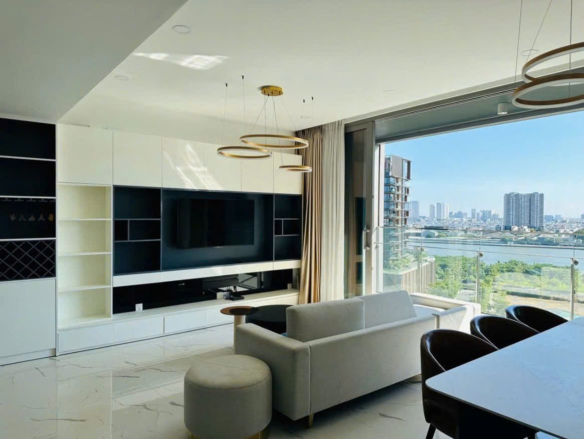 Căn hộ có diện tích 127m², được thiết kế theo phong cách hiện đại với không gian mở rộng rãi và tối ưu công năng sử dụng. Phòng khách sang trọng với bộ sofa cao cấp, bàn trà tinh tế cùng hệ thống đèn trang trí hiện đại, tạo nên không gian sống ấm cúng và đẳng cấp. Từ phòng khách, cư dân có thể nhìn ra ban công với view sông thoáng đẹp, đón ánh sáng tự nhiên và gió mát.