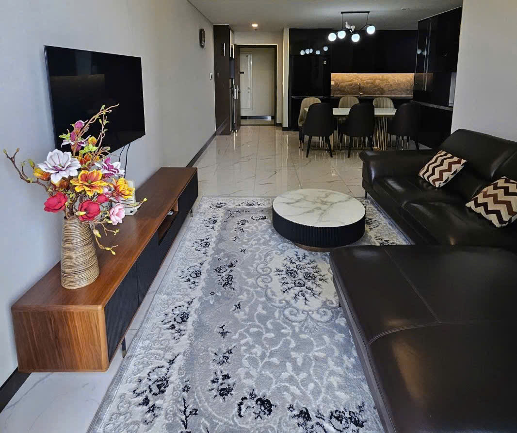 Căn hộ được thiết kế 2 phòng ngủ, không gian mở giữa phòng khách và bếp tạo cảm giác rộng rãi, thông thoáng. Phòng khách trang bị sofa lớn, kệ TV cùng nội thất tinh tế, phù hợp cho sinh hoạt và tiếp khách.