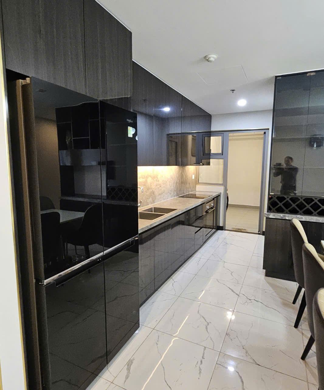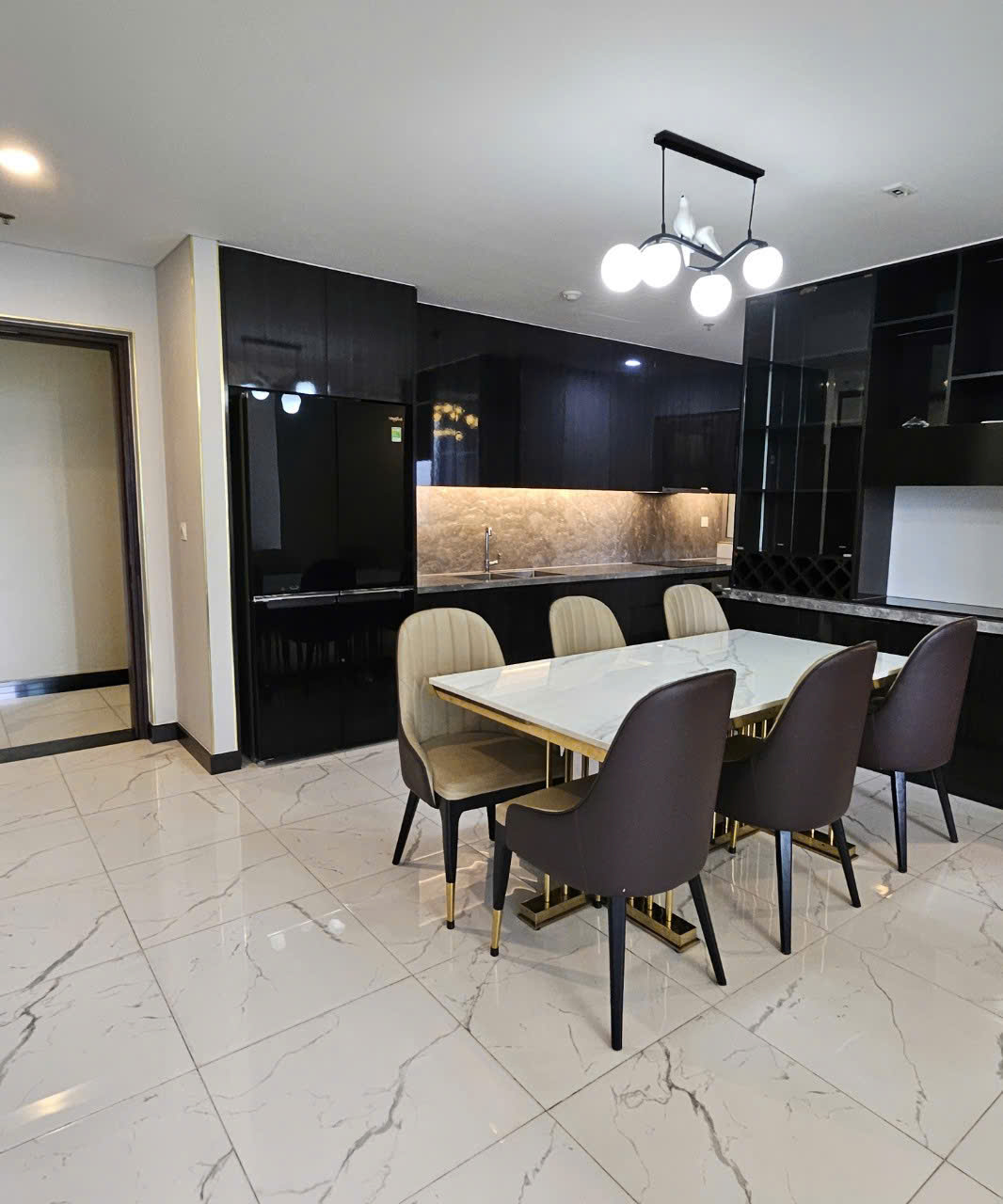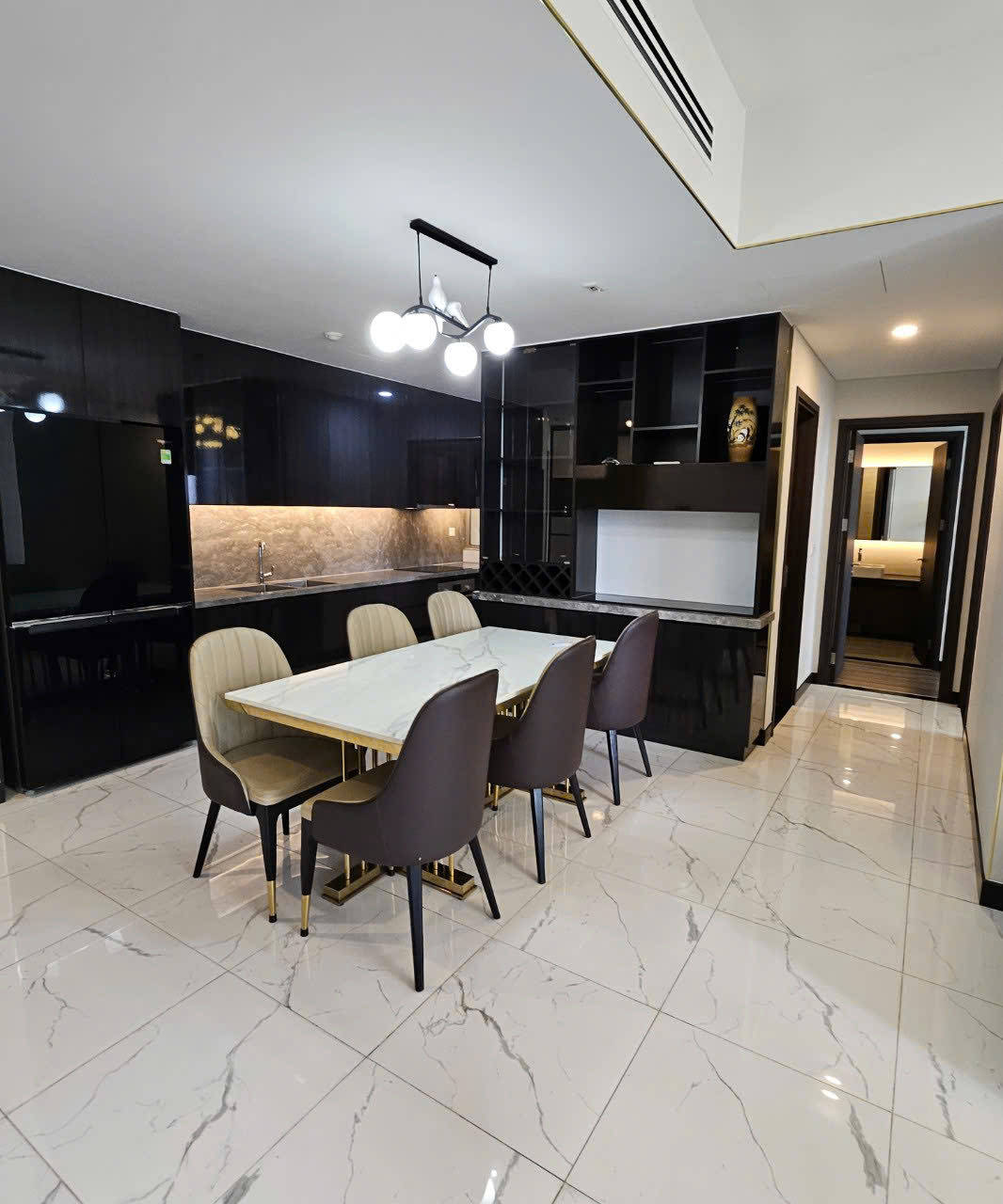 Căn hộ full nội thất, phong cách hiện đại, tông màu sang trọng. Khu bếp đầy đủ thiết bị cao cấp, bố trí liền kề khu vực ăn uống tiện nghi.