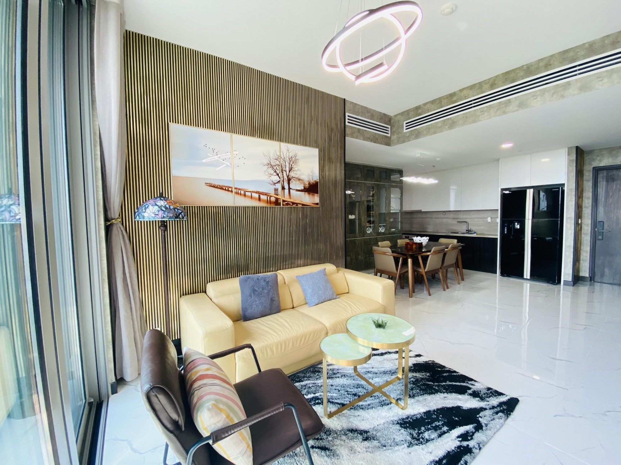Phòng khách thông thoáng, đón nhiều ánh sáng tự nhiên nhờ hệ cửa kính lớn, kết nối hài hòa với khu vực bếp và bàn ăn. Không gian tạo cảm giác thoải mái, tinh tế, thích hợp cho sinh hoạt hằng ngày cũng như tiếp khách.