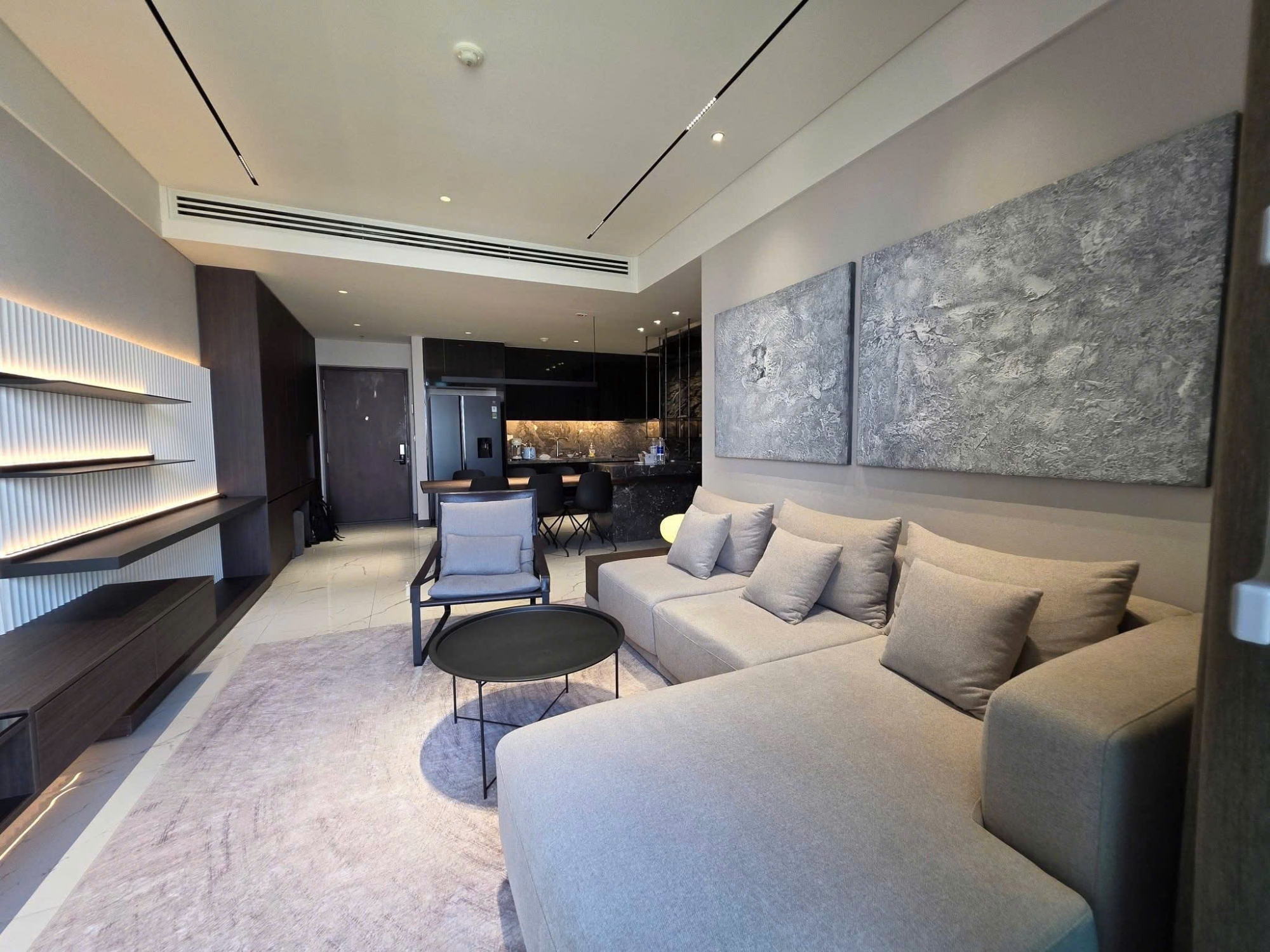The apartment features a modern design with a spacious layout and plenty of natural light. It is fully furnished with high quality and elegant furniture that creates a comfortable and stylish living space. The living room is beautifully arranged with a comfortable sofa, modern television cabinet and decorative lighting system.