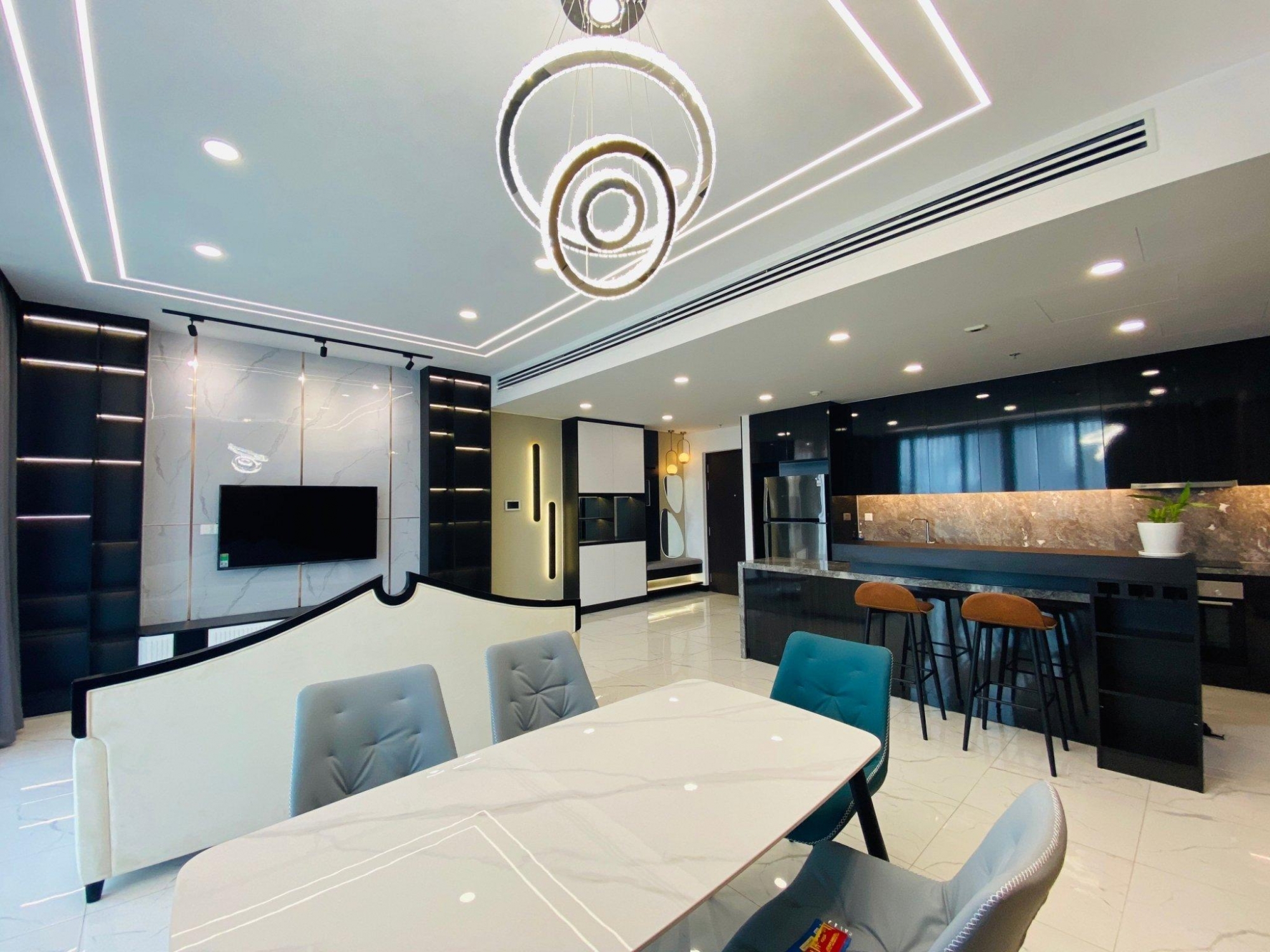 The unit is fully furnished with premium materials and designer finishes. Highlights include built-in cabinetry, a marble kitchen island, modern lighting systems, and high-quality appliances. The neutral color palette combined with sophisticated interior details delivers a warm yet luxurious atmosphere.